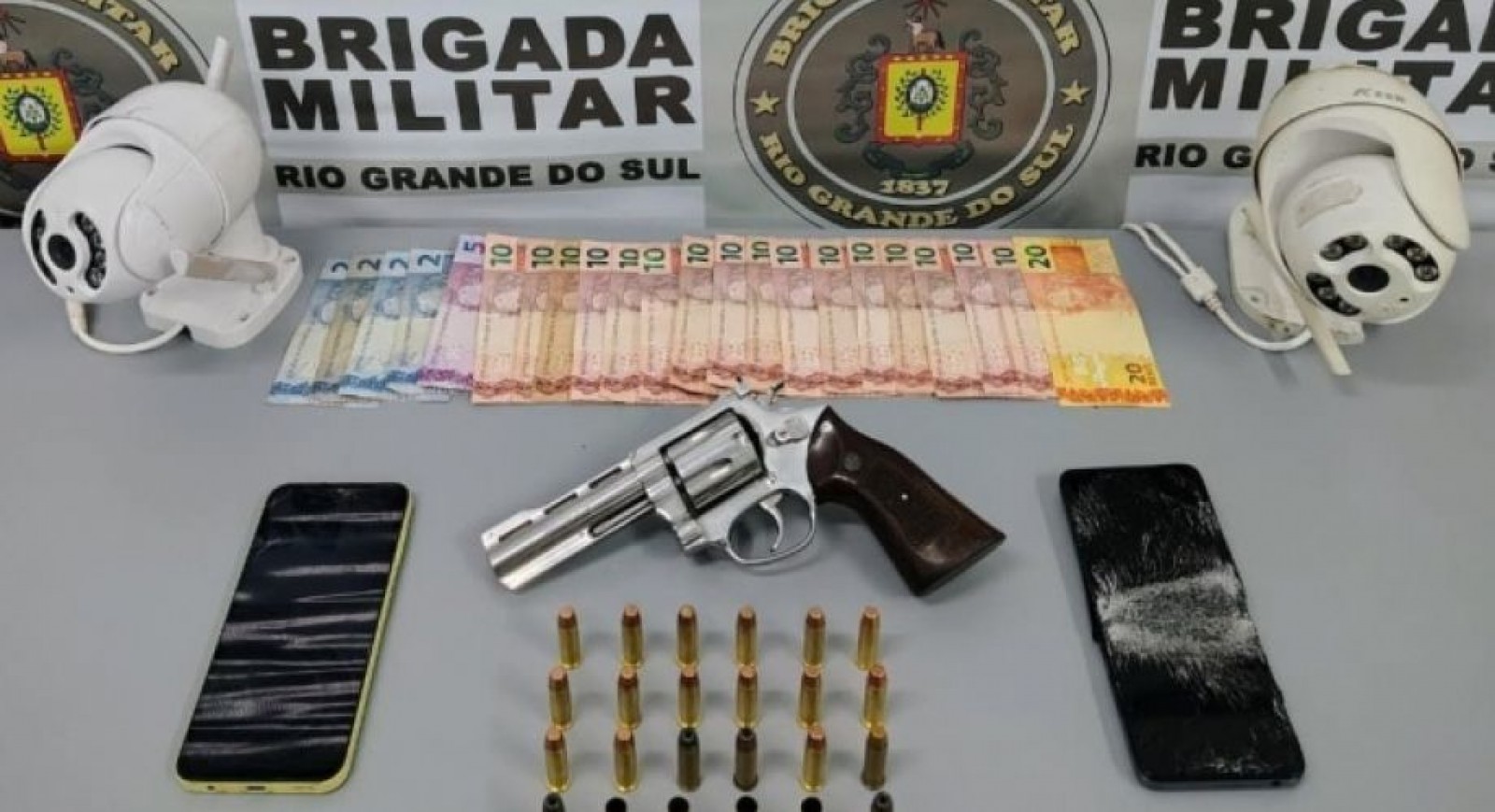 No interior do imóvel foram apreendidos, R$193, um revólver calibre .38 com três munições deflagradas, além de outras 17 munições intactas e uma municiada e não deflagrada.