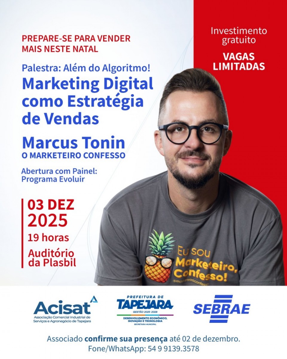 A Associação Comercial, Industrial, de Serviços e Agropecuária de Tapejara (ACISAT), em parceria com a Prefeitura de Tapejara e o Sebrae, realiza na quarta-feira, 03 de dezembro, às 19h, no Auditório da Plasbil Revestimentos, um encontro voltado a empresários, empreendedores e profissionais que desejam fortalecer suas estratégias para o período mais movimentado do comércio: o Natal.