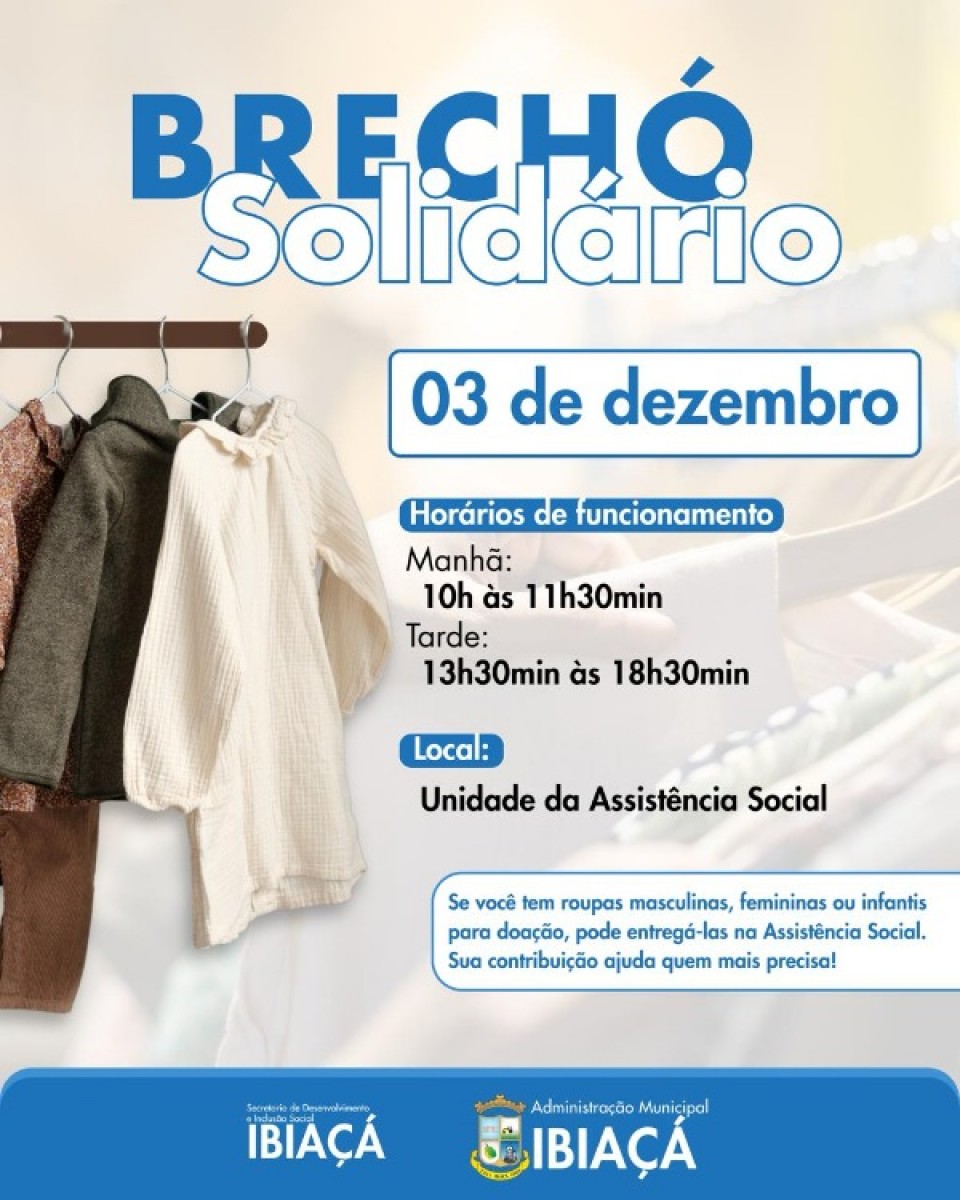 É hoje quarta feira 3 de dezembro que acontece a 9ª edição do Brechó Solidário, uma iniciativa da Secretaria de Desenvolvimento e Inclusão Social em parceria com o CRAS de Ibiaçá. O evento, realizado sempre na primeira quarta-feira do mês, disponibiliza gratuitamente roupas e calçados para famílias em situação de vulnerabilidade social.