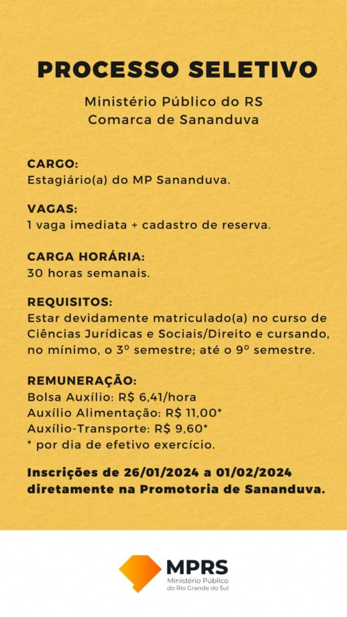 O Ministério Público do Rio Grande do Sul Comarca de Sananduva está com as inscrições abertas para a Vaga de Estagiário, dispõe de 1 Vaga, bem como à formação de cadastro de reserva para vagas que venham a surgir na vigência deste Processo Seletivo.