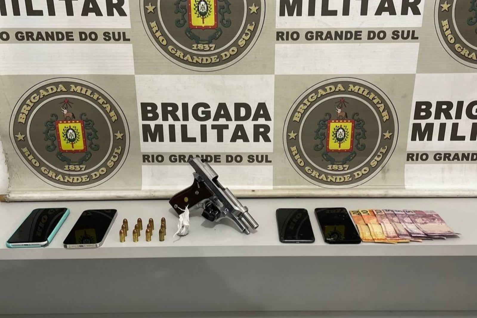 Na operação, a polícia recolheu diversos itens, incluindo uma pistola calibre 380, 12 munições intactas do mesmo calibre, um carregador, quatro celulares, uma quantia em dinheiro e uma porção de substância semelhante à maconha.