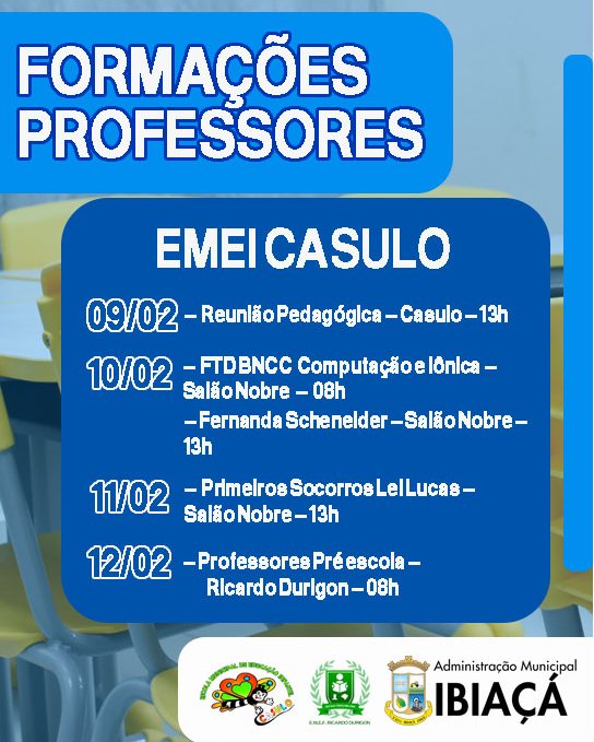 Na EMEI Casulo, estão previstas formações específicas ao longo da semana, além das reuniões com os pais. O encontro com responsáveis da etapa creche ocorre no dia 10 de fevereiro, às 19h, no Salão Nobre, enquanto a reunião da pré-escola está marcada para 11 de fevereiro, no mesmo horário e local. O início das aulas para a pré-escola será no dia 18 de fevereiro.