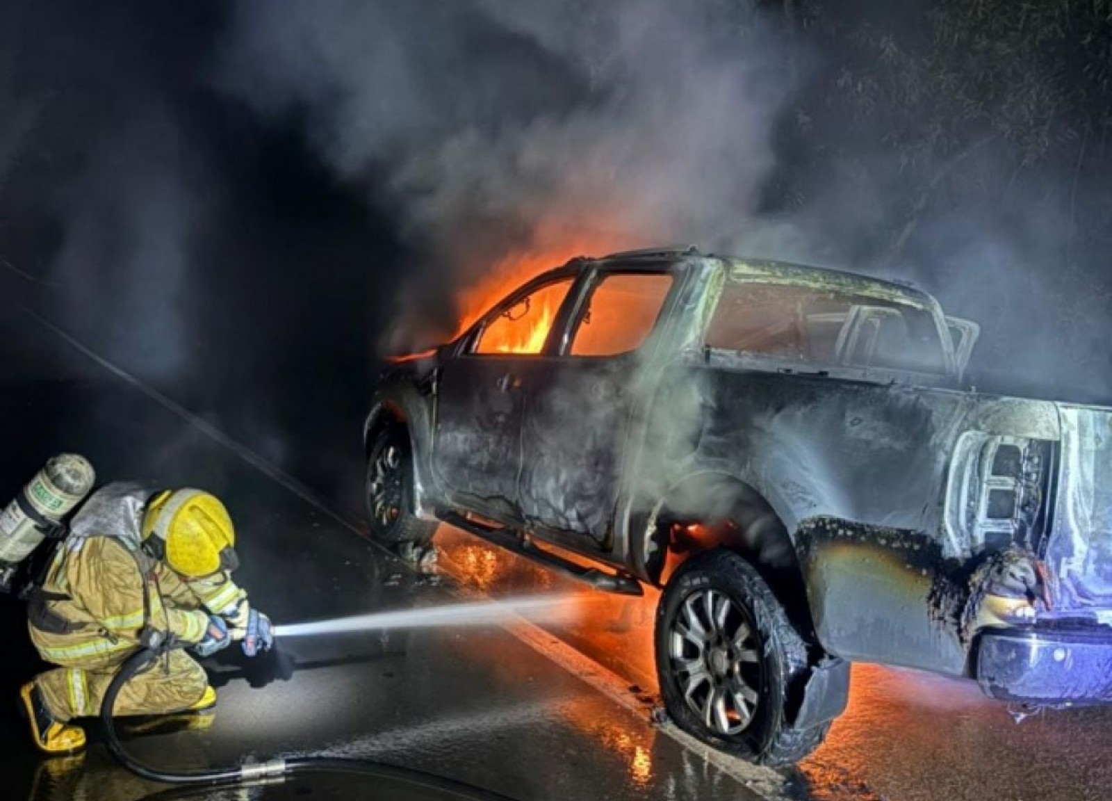 O fogo se alastrou rapidamente, mesmo assim os bombeiros apagaram as chamas, mas não foi possível impedir a perda total do veículo. Trata-se de uma caminhonete Ford Ranger com placas da Argentina. As causas do incêndio serão apuradas. Ninguém ficou ferido.