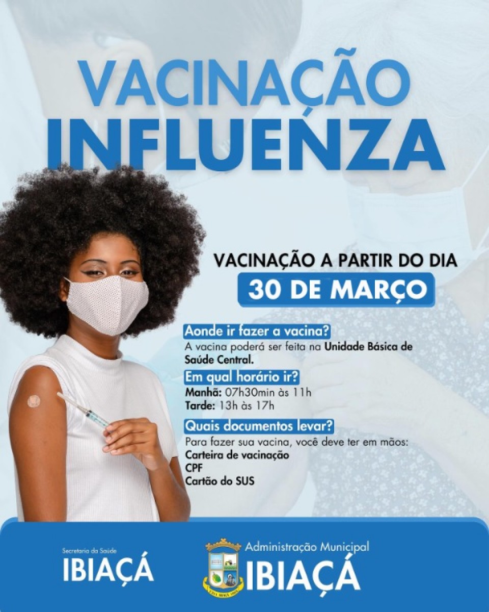 A Prefeitura de Ibiaçá, por meio da Secretaria Municipal de Saúde, inicia na próxima segunda-feira, 30 de março, a Campanha Nacional de Vacinação contra a Gripe (Influenza) 2026. A ação segue as diretrizes do Ministério da Saúde e tem como foco a imunização dos grupos prioritários.