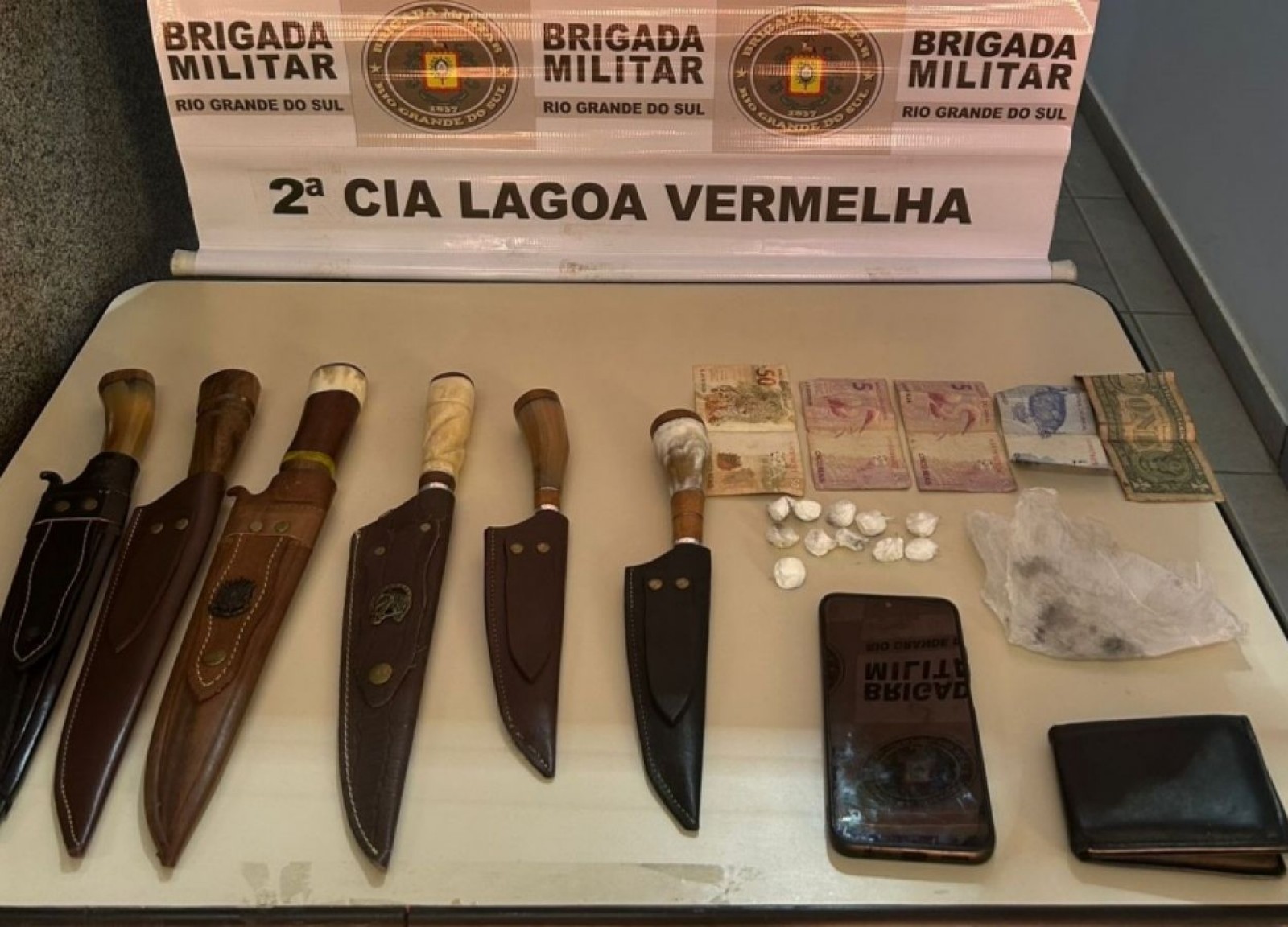 Além da droga, foram apreendidos valores em dinheiro, inclusive em moeda estrangeira, seis facas artesanais, um telefone celular e o veículo utilizado.