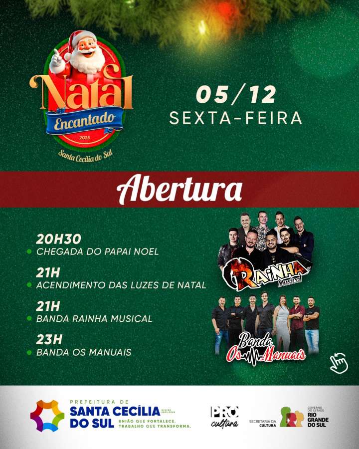 Promovido pela Prefeitura de Santa Cecília do Sul, com apoio da Secretaria da Cultura do Rio Grande do Sul, o evento reforça o compromisso do município em proporcionar momentos de lazer, confraternização e magia natalina para as famílias.