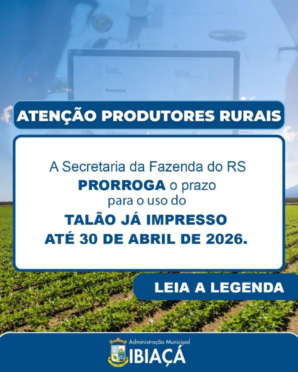 O Setor de Blocos da Prefeitura Municipal, informa aos produtores rurais sobre a decisão da Secretaria da Fazenda do Estado do Rio Grande do Sul (SEFAZ-RS), que prorrogou até 30 de abril de 2026 o prazo para utilização do talão de produtor rural já impresso (modelo A4) na emissão de notas fiscais em operações internas.