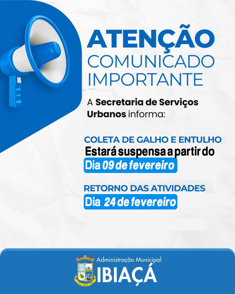 A Prefeitura de Ibiaçá informou, no final da semana passada, que a coleta de galhos e entulhos está suspensa a partir desta segunda-feira, 9 de fevereiro. Conforme o comunicado, a interrupção temporária do serviço foi definida porque as equipes estarão integralmente mobilizadas nos preparativos da 74ª Romaria de Nossa Senhora Consoladora, que acontece nos dias 21 e 22 de fevereiro.