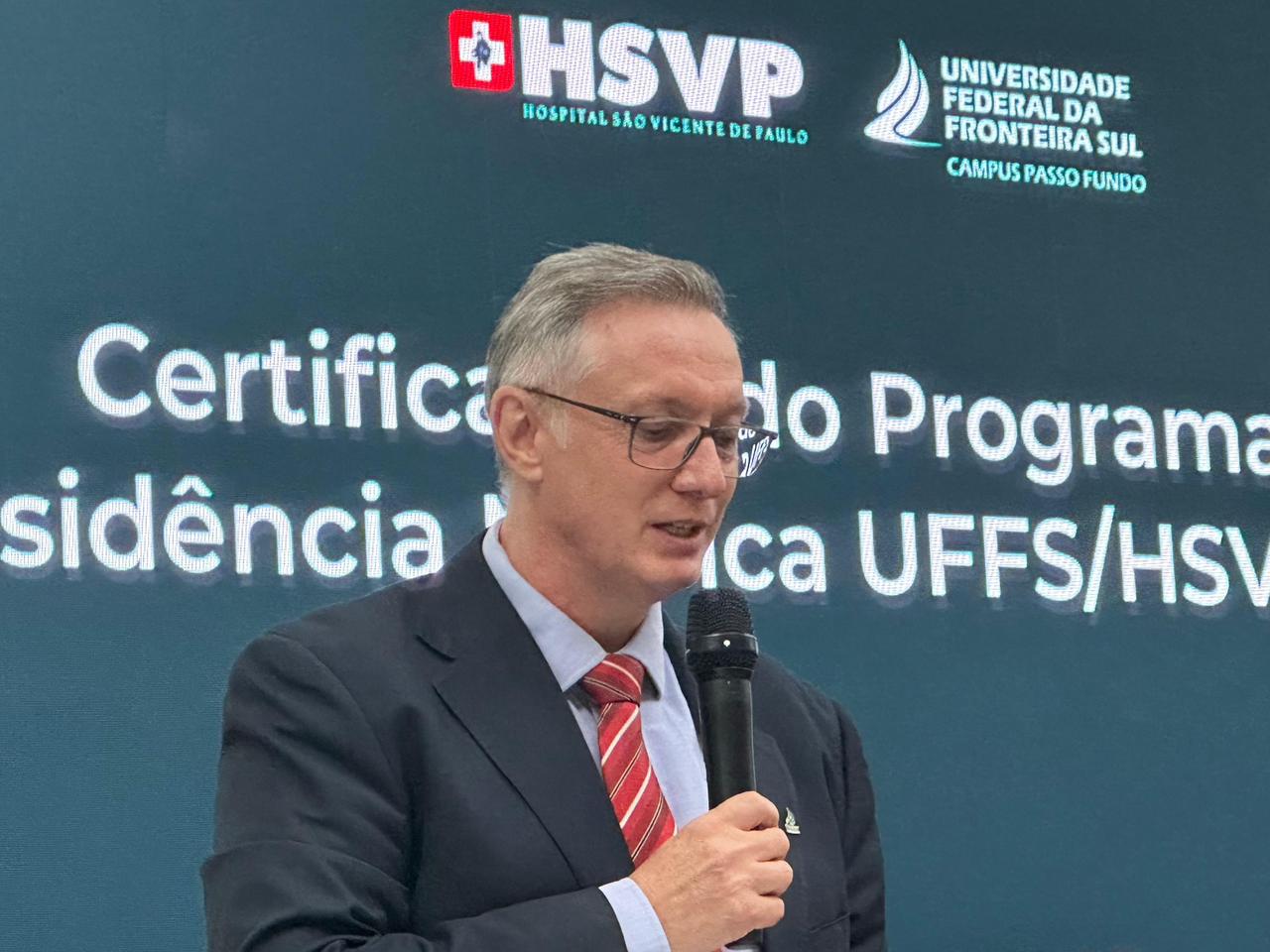 O presidente do HSVP, José Miguel Rodrigues da Silva disse que é uma alegria imensa celebrar este momento ao lado da Universidade Federal da Fronteira Sul, parabenizando cada formando por sua trajetória de esforço, ética e compromisso. "Hoje, reconhecemos não apenas o mérito de vocês, mas também o papel essencial dos preceptores, supervisores e de toda a equipe envolvida na formação, cuja dedicação diária torna possível entregar à sociedade profissionais altamente capacitados. Que esta conquista seja apenas o início de uma carreira marcada por responsabilidade, humanidade e excelência".