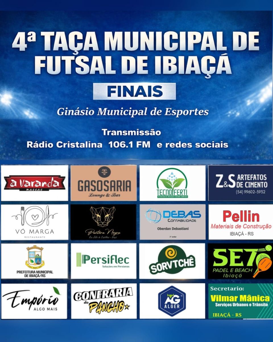 A 4° Taça Municpal de Ibiaça de futsal teve a transmiçao ao vivo pelas redes socias / you tube e atraves do 106.1 Radio Cristalina Fm e reforça a importancia do esporte local, promovendo integraçao, lazer, valorizaçao dos atletas da comunidade. O evento foi considerado um sucesso tanto pela organizaçao quanto pelo alto nivel das partidas disputadas.