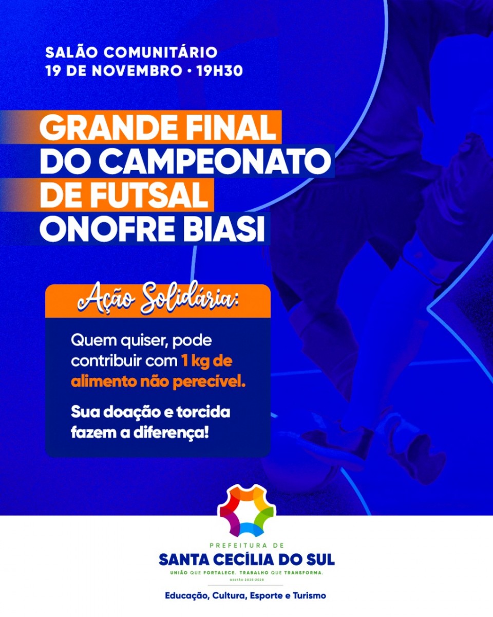 Santa Cecília do Sul viverá uma noite de muita emoção nesta quarta-feira, dia 19 de novembro, com as finais do Campeonato Regional de Futsal – Taça Onofre Biasi. Depois de dois meses e meio de disputas, a competição chega ao seu desfecho no Salão Comunitário, reunindo as melhores equipes do município e da região.