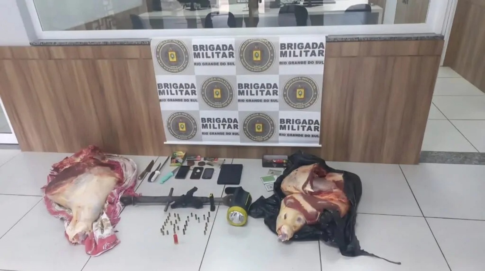 Entre os materiais apreendidos estão uma pistola calibre 9mm, 17 munições calibre 9mm, 11 munições calibre .38, uma munição calibre .38 curto, uma munição calibre .12, todas intactas, porções de maconha, aproximadamente 50 quilos de carne, três facas, uma chaira, quatro telefones celulares e um tablet.
