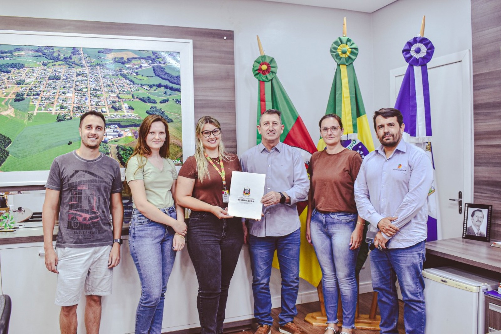 Na sexta-feira (16), representantes da Secretaria de Desenvolvimento Urbano e Metropolitano (Sedur) estiveram no Gabinete do Prefeito de Ibiaçá, Jones Roberto Cecchin, acompanhados da fiscal ambiental do município, Cristiane Both Pizinatto, da engenheira civil do município, Lidiane Bedin, e do gestor de convênios do município, Rafael Lovatto, para apresentar o projeto de desassoreamento do Rio Araçá.