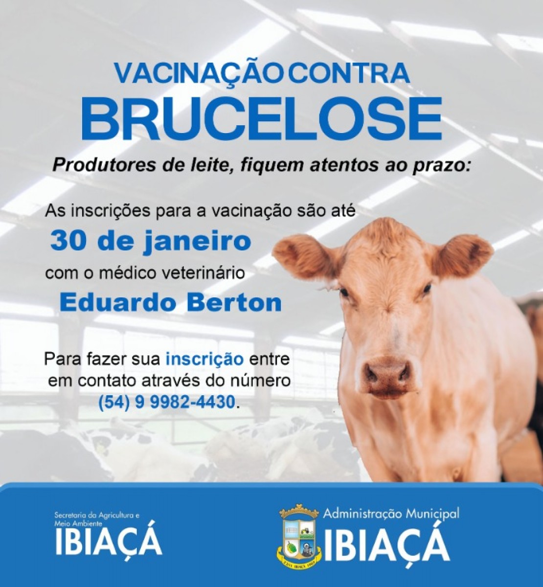 A Prefeitura de Ibiaçá anunciou na sexta-feira, dia 23, a abertura das inscrições para a vacinação contra a brucelose, uma iniciativa voltada para a saúde dos rebanhos e a segurança da produção leiteira no município. A ação busca prevenir a doença, garantindo maior qualidade sanitária e fortalecendo a atividade rural local.