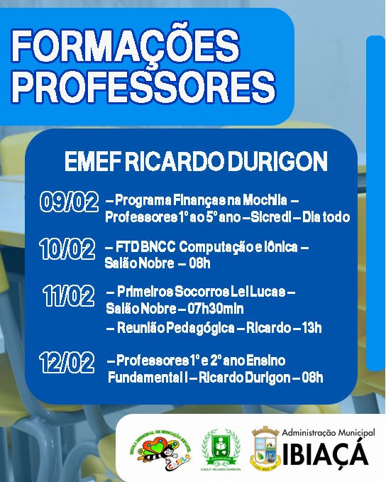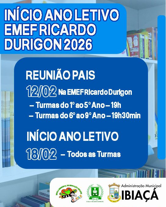 Já na EMEF Ricardo Durigon, as formações dos professores acontecem entre os dias 9 e 12 de fevereiro, com atividades voltadas aos anos iniciais e finais do Ensino Fundamental. A reunião com os pais será realizada no dia 12 de fevereiro, na própria escola, às 19h para as turmas do 1º ao 5º ano e às 19h30min para as turmas do 6º ao 9º ano. O retorno dos estudantes ocorre em 18 de fevereiro, para todas as séries.