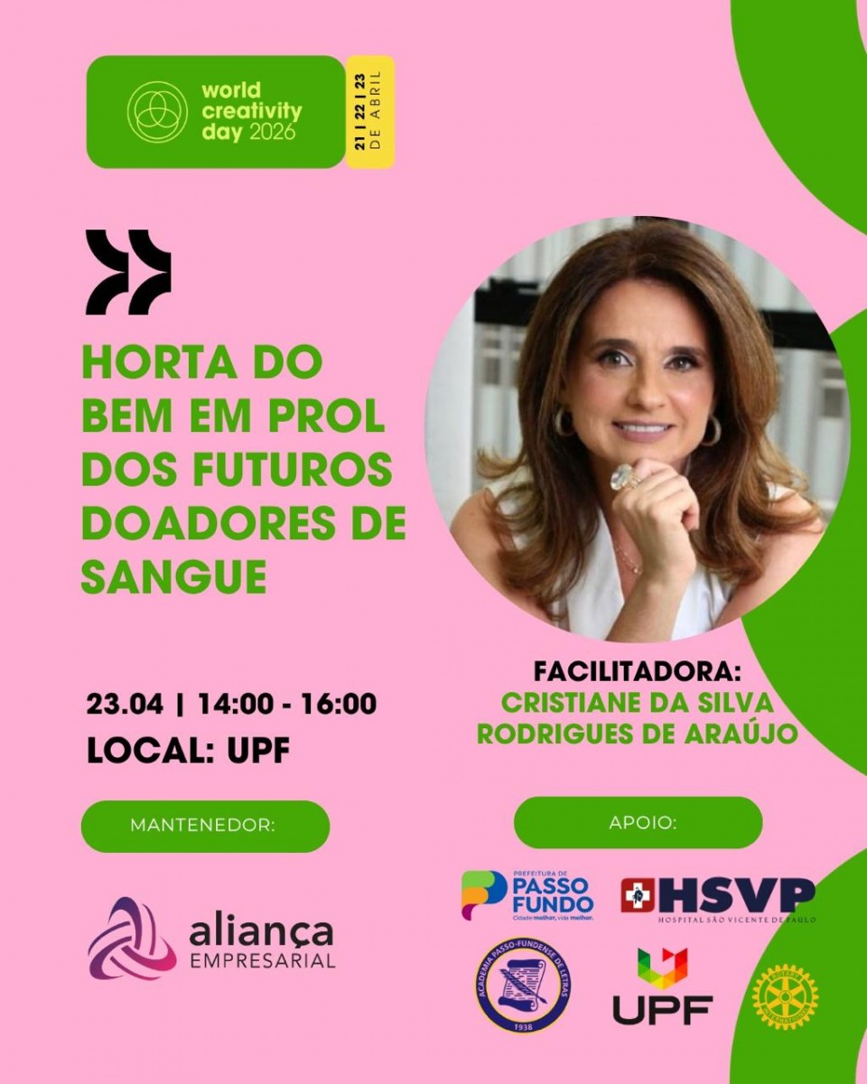 O Hospital São Vicente de Paulo (HSVP) confirmou sua participação na edição deste ano do World Creativity Day (WCD), o maior festival colaborativo de criatividade do mundo. A instituição apresentará a iniciativa "Horta do Bem em Prol do Doador de Sangue" no dia 23 de abril, com início às 14h, na Arena do UPF Parque, no Campus I da Universidade de Passo Fundo (UPF). O projeto é uma ação estratégica que integra sustentabilidade, educação e conscientização social, vinculada ao programa "Doadores do Amanhã" e conduzida pela Dra. Cristiane Rodrigues de Araújo, responsável técnica do Serviço de Hemoterapia do HSVP.